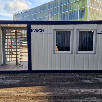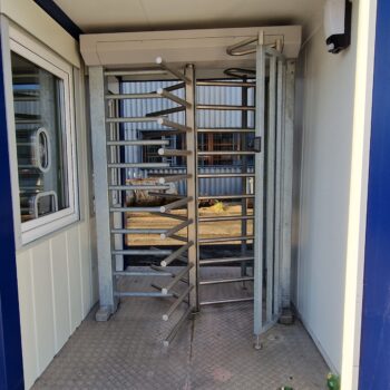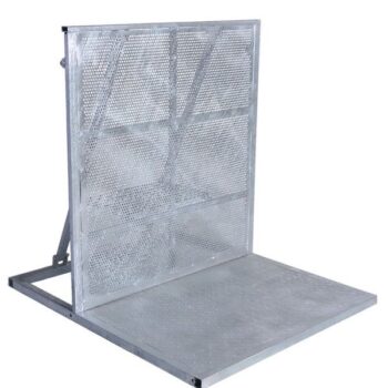 In vrezinkter Stahlkonstruktion, für die Sicherung von Konzertbühnen. Die Bühnengitter sind für den Transport und die Lagerung zusammenklappbar. Die Trittstufe auf der Rückseite gibt dem Sicherheits- und Sanitätspersonal die Möglichkeit, gefährdete Personen zu bergen oder vordrängende Person zurückzuhalten.